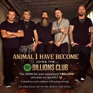 Three Days Grace попали в клуб миллиардеров Spotify с композицией "Animal I Have Become". Кроме того, коллектив претендует на Juno Awards в таких категориях как "Group Of The Year" и "Rock Album Of The Year".